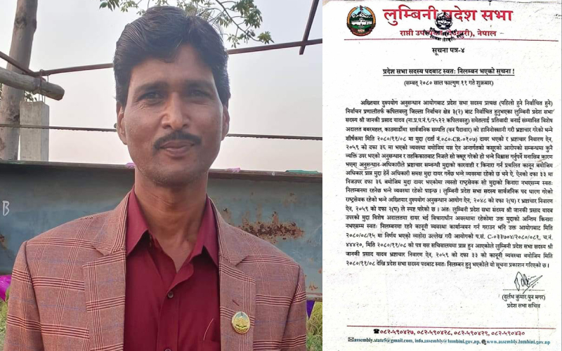 लुम्बिनी प्रदेश सभाका सदस्य कपिलवस्तु क्षेत्र नं. ३ (१) निर्वाचन क्षेत्रबाट निर्वाचित जानकीप्रशाद यादव पदबाट निलम्बित भएका हुन । लुम्बिनी प्रदेशसभा सचिवालयका सचिव दुर्लभकुमार पुनले सार्वजनिक रुपमा सूचना जारी गर्दै यादबलाई प्रदेशसभा सदस्यबाट निलम्बन गरिएको उल्लेख गरेका छन् ।