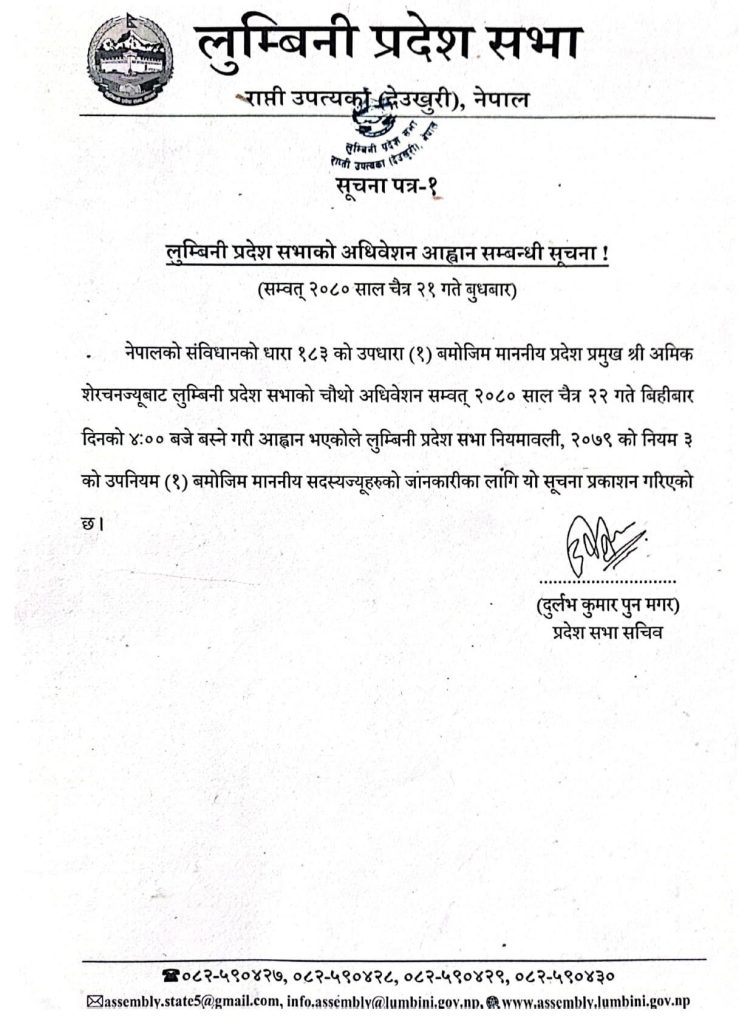 लुम्बिनी प्रदेशले चैत २२ गते प्रदेश सभाको बैठक आह्वान गरेको छ । सत्ता गठबन्धन परिवर्तन सगै नेकपा माओबादिले प्रदेश सरकारको नेत्रेत्व को तयारी गरे अनुसार बर्तमान मुख्यमन्त्री डिल्ली बहादुर चौधरीले बिश्वासक मत लिनु पर्ने अथवा राजिनामा दिनुपर्ने हुन्छ ।