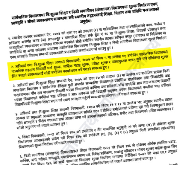 गत चैत ७ गते जारी परिपत्रमा भनिएको छ, ‘अनिवार्य तथा निःशुल्क शिक्षा सम्बन्धी नियमावली, २०७७ को नियम ५ मा उल्लेख भए बमोजिम सार्वजनिक विद्यालयले माध्यमिक तहसम्म विद्यार्थी भर्ना शुल्क, मासिक पढाइ शुल्क, परीक्षा शुल्क र पाठ्यपुस्तक बापत कुनै पनि शीर्षकमा शुल्क लिन नपाउने व्यवस्थालाई सोही बमोजिम कार्यान्वयन गर्ने गराउने व्यवस्था हुन् ।’
