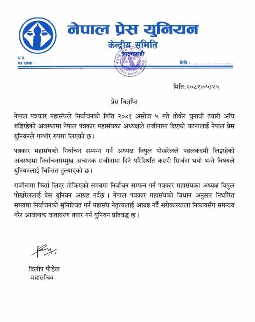 नेपाल पत्रकार महासंघका अध्यक्ष बिपुल पोख्रेलले दिएको राजिनामा फिर्ता गर्न नेपाल प्रेस युनियनले आग्रा गरेको छ | युनियनको आज मंगलबार बसेको बैठकले सोमबार पोख्रेलले पदबाट दिनुभएको राजीना फिर्ता लिन आग्रा गरेको युनियनका महासचिव दिलिप पौडेलले जानकारी दिनुभयो | अध्यक्ष पोख्रेलले तिन पटक निर्वाचन घोषण गर्दा बिभिन्न तहबाट असहयोग भएको भन्दै राजिनामा दिनुभएको थियो |