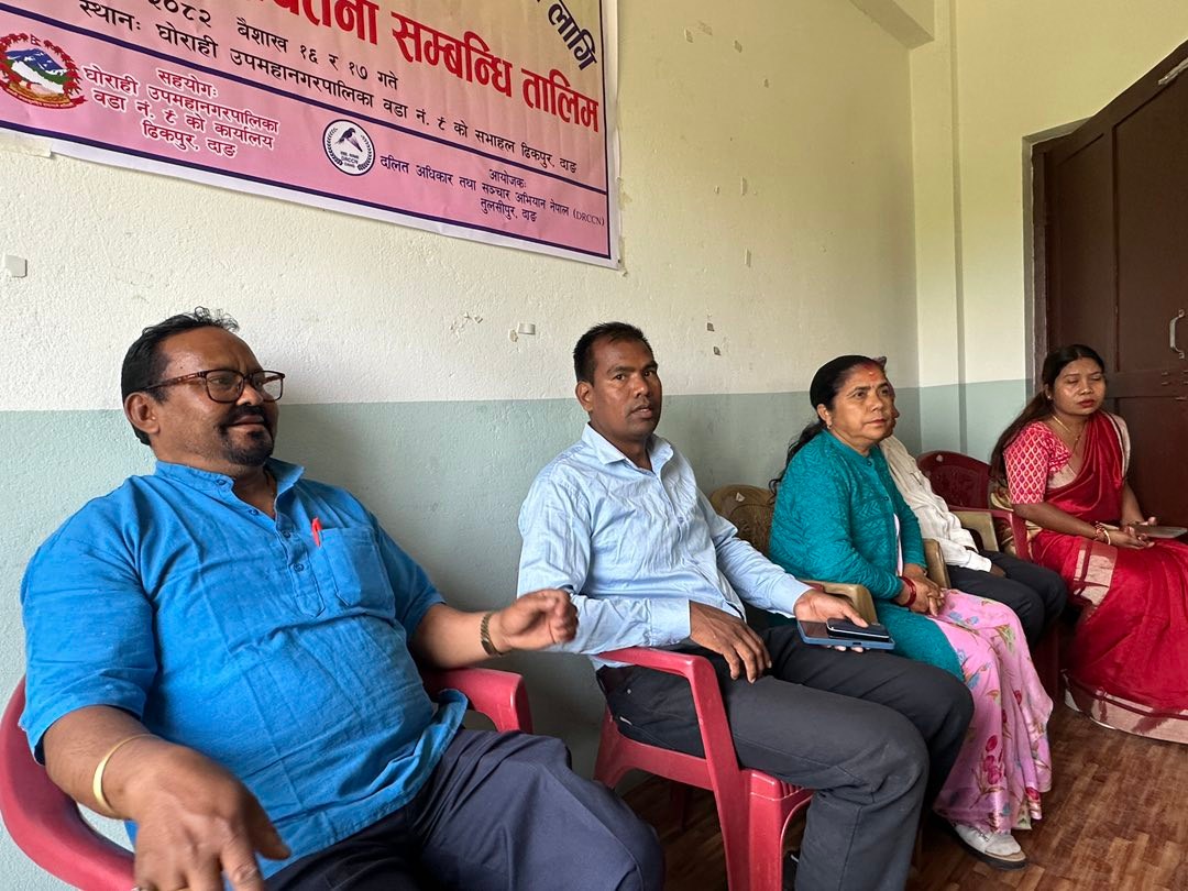 घोराही उपमहानगरपालिका वडा नम्वर ९ मा दलित तथा गैरदलितलाई कानुनी साक्षारता दिन शुरु गरिएको छ । वडालाई जातिय भेदभाव र छुवाछुत मुक्त घोषणा बनाउने रणनीतिका साथ सचेतना तालिम दिन थालिएको वडा अध्यक्ष चैतु कुमार चौधरीले जानकारी दिनुभयो । बिभिन्न ३२ बढी टोल बिकास संस्थाका अध्यक्ष,बिद्यालयका प्रधानाध्यापक, धर्मगुरु, जनप्रतिनिधि, कर्मचारी,दलित समुदाय लगायतको सहभागिता रहेको आयोजक दलित अधिकार तथा सञ्चार अभियानका अध्यक्ष निर्मल नेपालीले जानकारी दिनुभयो ।