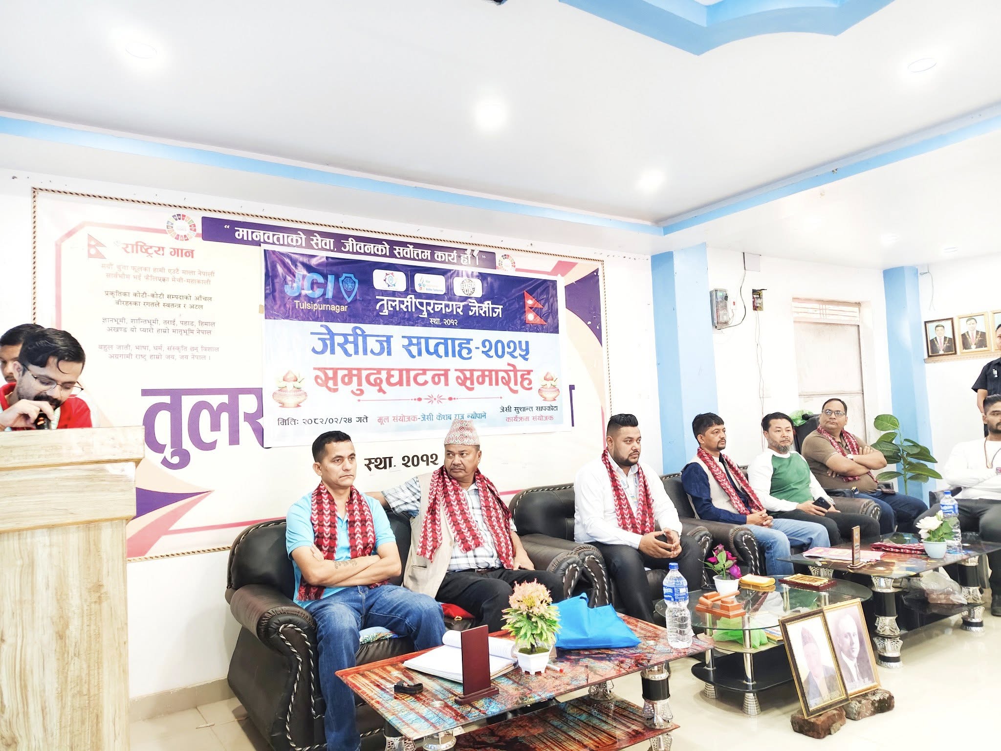 तुलसीपुर नगर जेसीजका अध्यक्ष संदीप भुषालको अध्यक्षता एवम पूर्वमुख्यमन्त्री डिल्लीबहादुर चौधरीको प्रमुख आतिथ्यतामा जेसीज सप्ताहको उद्घाटन गरिएको थियो । सो अवसरमा मानव अधिकार तथा शान्ति समाजका पूर्वकेन्द्रिय बरिष्ठ उपसभापति एबम संवाद समुहका बरिष्ठ सहजकर्ता सुशील बस्नेत, बरिष्ठ अधिबक्ता प्रदिप धिताल,तुलसीपुर जेसीजका पूर्व अध्यक्ष दिपेश भण्डारी लगायतले शुभकामना मन्तब्य ब्यक्त गर्नुभएको थियो । तुलसीपुर नगरजेसीजले आज शनिबारदेखि शुरु गरेको साता ब्यापी कार्यक्रम अन्तर्गत २५ गते पूर्वअध्यक्षहरुसँग अनुभव आदान प्रदान, २६ गते बिद्यार्थीसँग जेसीज, २७ गते माबि बालापुरमा शैक्षिक सामाग्री बितरण, २८ गते बक्तीत्व कला प्रतियोगीता, २९ गते ब्याडमिन्टीन प्रतियोगिता र ३० गते रक्तदान कार्यक्रम आयोजना गरिएको मुल आयोजक समितिका संयोजक केशवराज न्यौपानेले जानकारी दिनुभयो ।