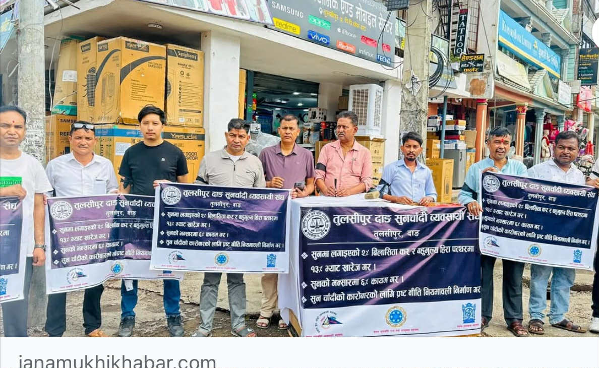 सुनचाँदी व्यवसायी संघले आज बिहीबार पसल बन्द गरि आन्दोलनमा उत्रेको छ । संघले सरकारले आर्थिक बर्ष २०८२।०८३ को बजेट वक्तव्यमार्फत सुनचाँदी तथा हिरा पत्थरका गरगहनामा विलासिता कर र भ्याट लगाउने जनाएपछि त्यसले उपभोक्तालाई मर्का पर्नुका साथै सुनचाँदी व्यवसायलाई धारासायी बनाउने भन्दै आव्हान गरिएको चरणबद्ध आन्दोलन अन्तर्गत बुधबार प्रदर्शन गरेको थियो ।
