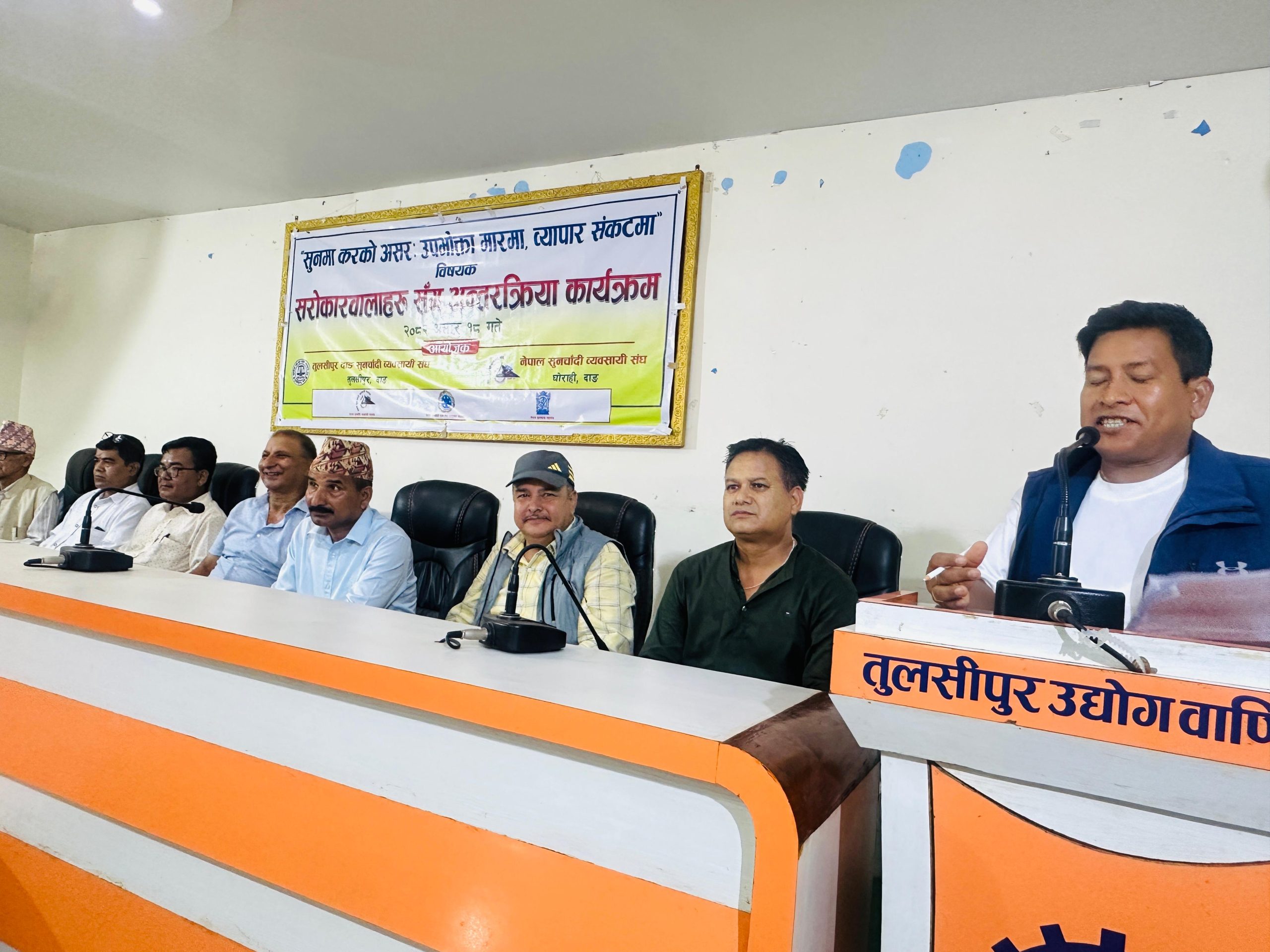 तुलसीपुर दाङ सुनचाँदी ब्यबसायि संघका अध्यक्ष हरिकृष्ण बिश्वकर्माको अध्यक्षता एबम पूर्व स्वास्थ्स्य राज्य मन्त्री हिराचन्द्र केसीको प्रमुख आतिथ्यतामा सुनमा करको असर, उपभोक्ता मारमा ब्यापार संकटमा बिषयक अन्तरक्रिया कार्यक्रम भएको हो । कार्यक्रममा स्वागत मन्तब्य नेपाल सुनचाँदी ब्यबसायि संघ घोराहीका अध्यक्ष बिनोद बिश्वकर्माले, अन्तरक्रिया कार्यक्रमको औचित्य माथि प्रकाश नेपाल सुनचादी ब्यबसायि महासंघ लुम्बिनी प्रदेशका अध्यक्ष धुव्रराज गहतराजले र सञ्चालन महासचिव तुलसीराम सुनारले गर्नुभएको थियो ।