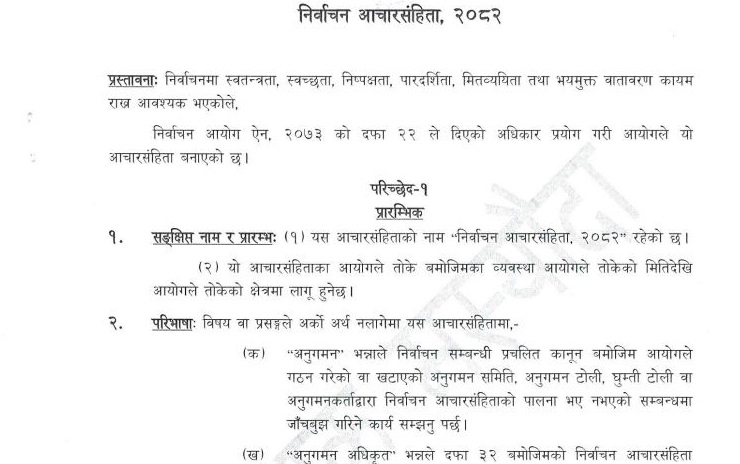 निर्वाचनमा स्वतन्त्रता, स्वच्छता, निष्पक्षता, पारदर्शिता, मितव्ययिता तथा भयमुक्त वातावरण कायम राख्न आवश्यक भएकोले निर्वाचन आयोग ऐन, २०७३ को दफा २२ ले दिएको अधिकार प्रयोग गरी आयोगले उक्त आचारसंहिता बनाएको हो । प्रस्तावित आचारसंहिता आयोगले तोकेको मितिदेखि आयोगले तोकेको क्षेत्रमा लागू हुने उल्लेख छ ।