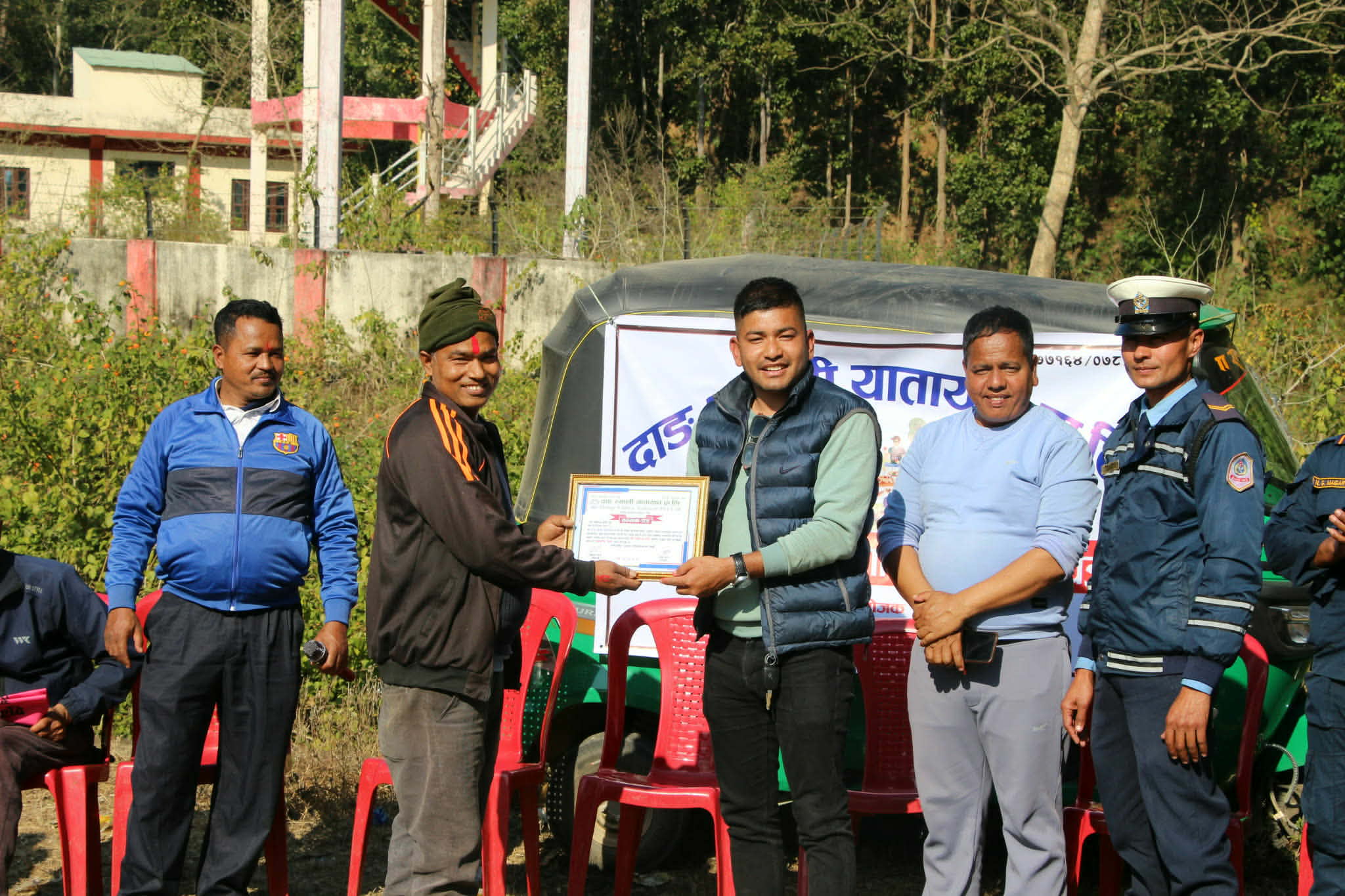 सो अवसरमा पश्चिम दाङ हापुरेका यातायात व्यवसायी पोखराज डाँगीलाई संस्थाले उत्कृष्ठ चालकको रूपमा सम्मानित गरेको छ । सवारी दुर्घटना नगरेका, ट्राफिक कारबाहीमा नपरेका, सम्पूर्ण कागजपत्र भएका र संस्थागत नियमहरूको परिपालना गर्ने लगायतका मापदण्ड अनुसार चालकहरुलाई संस्थाले विभिन्न समयमा प्रोत्साहन गर्न सम्मानित गर्ने गरेको छ । यस्ता सम्मानित कामहरुले चालकहरुमा हौसला प्रदान हुने सवारी दुर्घटना न्युनिकरणमा केही भुमिका खेल्ने संस्थाको बिश्वास छ ।