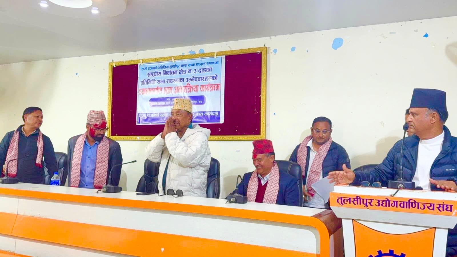 राप्ती राजमार्ग तुलसीपुर क्षेत्र सरोकार मञ्चले प्रतिनिधि सभा सदस्य पदका उम्मेदवारहरुसँग राप्ती राजमार्ग सडक मागदण्ड सम्बन्धमा ध्यानाकर्षण र अन्तरक्रिया कार्यक्रम गरेको हो ।